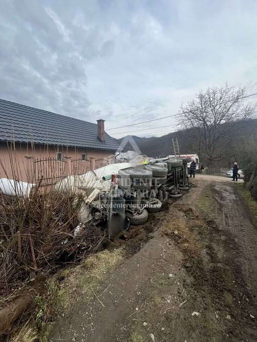 Un accident rutier s-a produs în localitatea Chiuiești, județul Cluj, unde o autobasculantă s-a răsturnat în afara părții carosabile.