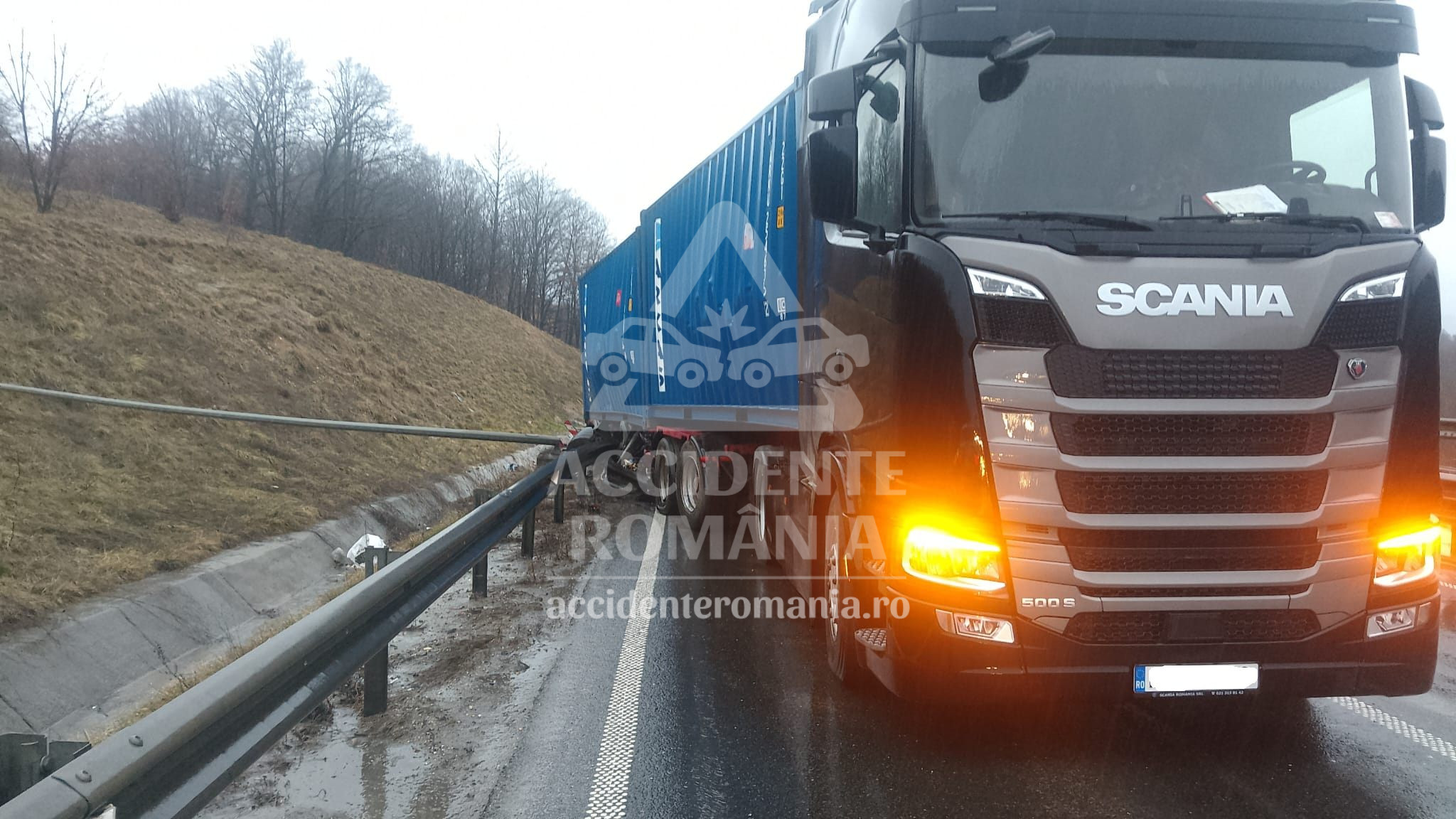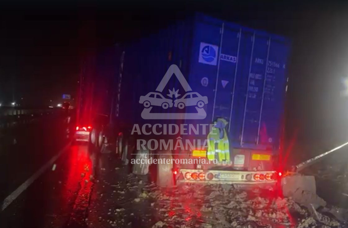 Potrivit informațiilor transmise de un martor aflat la fața locului, un camion cu containere a părăsit partea carosabilă și a ajuns în șanț, fiind implicată și remorca vehiculului. În urma incidentului, circulația în zonă se desfășoară alternativ.
