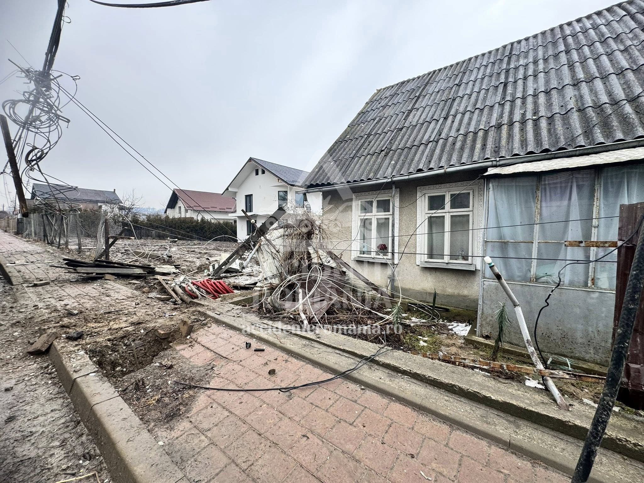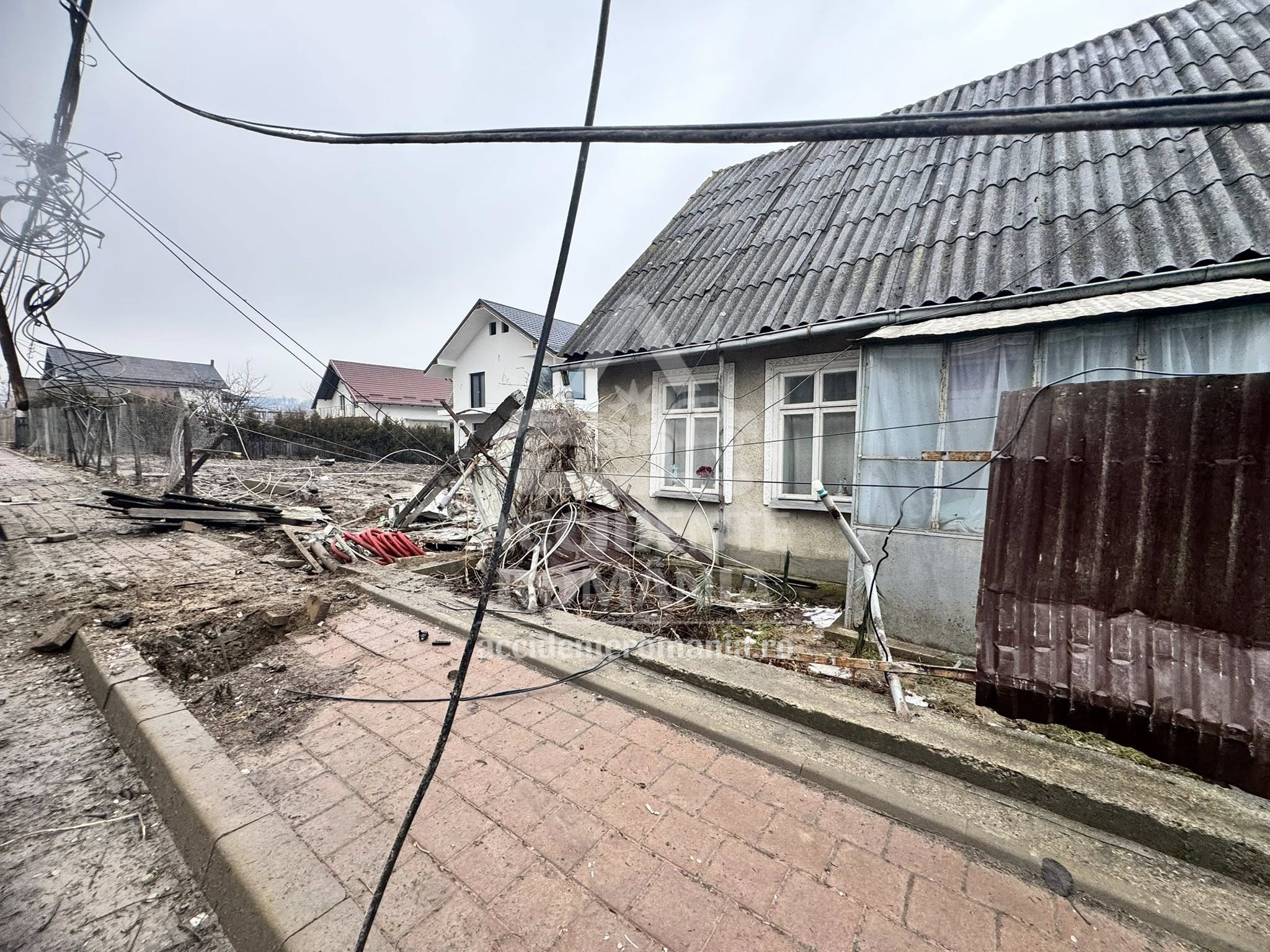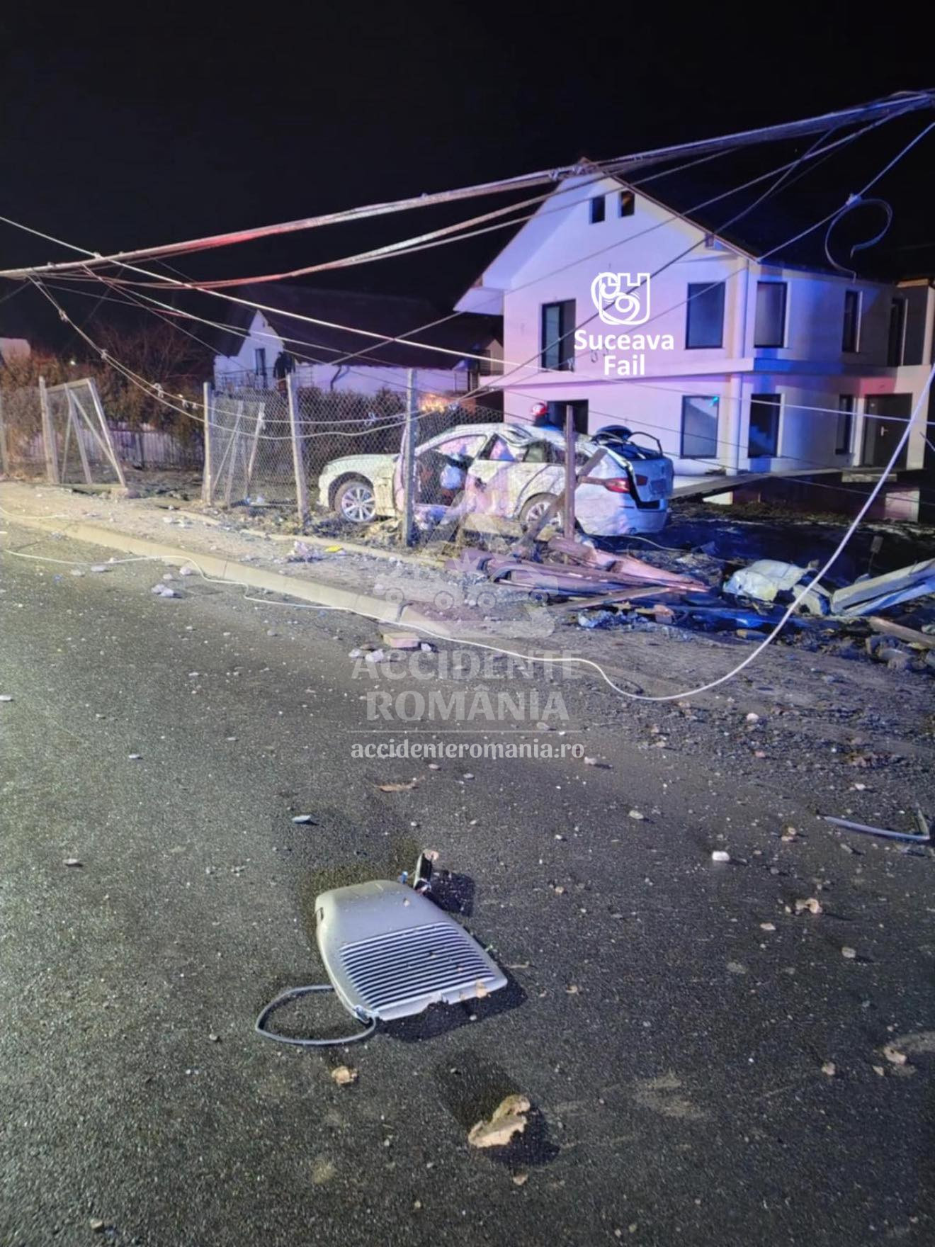 Autoturismul a rupt gardul unei locuințe și s-a oprit în curtea proprietății. În urma impactului, stâlpi și cabluri de electricitate au fost avariați, iar pe șosea au rămas împrăștiate numeroase resturi provenite din caroseria vehiculului.